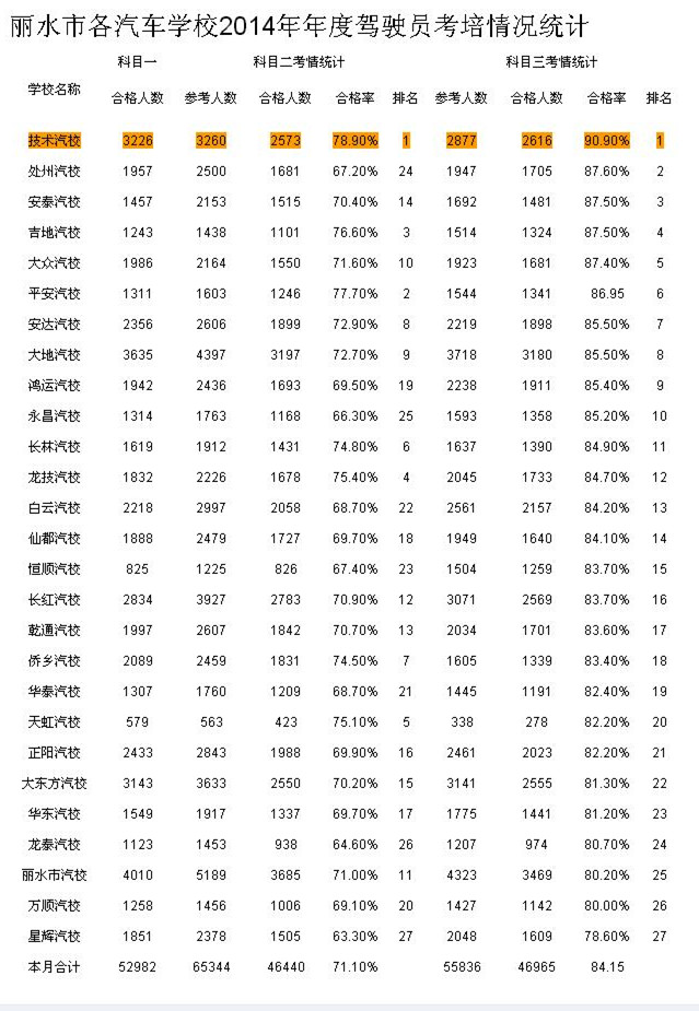 另据“丽水市各汽车学校2014年年度驾驶员考培情况统计”数据显示,丽汽集团汽校2014年年度驾驶员考培科目二、科目三的考试合格率分别达到78.90%和90.90%,两项排名均居全市第一。