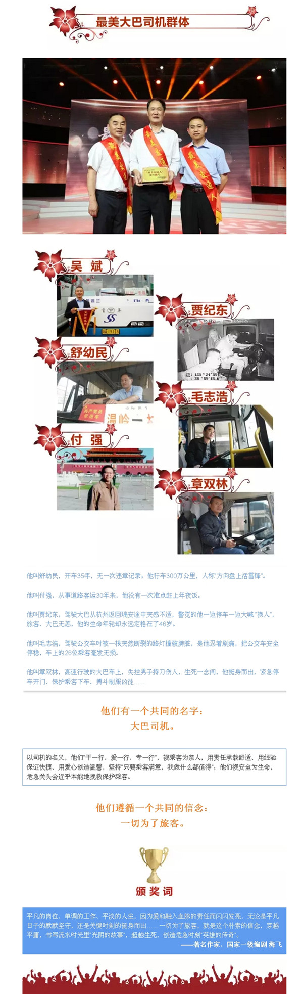 5月28日,省交通运输厅在浙江广电集团“最美浙江人•最美交通人”发布厅,发布了8位“最美交通人”个人和4家“最美交通人”集体的先进事迹,丽汽集团客长运分公司驾驶员章双林与其他5位大巴司机一起组成的“最美大巴司机群体”名列其中。