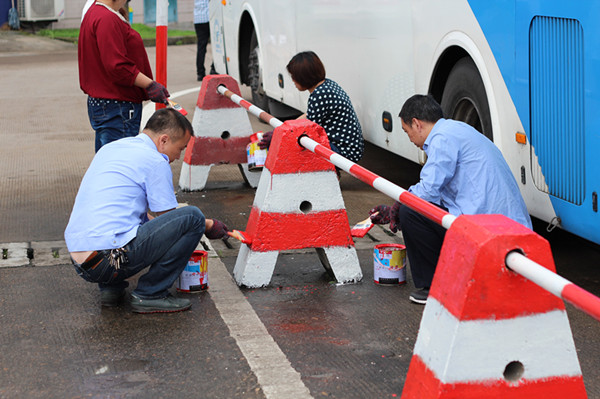 为响应总公司“开源节流,挖潜增效”的号召,也为配合客运东站的“安全生产月”活动,发扬“自己动手,丰衣足食”的劳动精神,在东站党支部委员金旭阳的倡导下,东站的党员、团员、入党积极分子及普通员工在6月5日上午早早地来到东站,进行第二波自己动手挖潜增效活动,利用自己的休息时间对东站年久褪色的隔离墩进行油漆刷新。