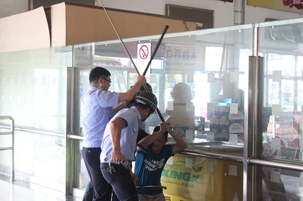 行车员发现普客候车厅内有一名醉酒男子情绪激动挥舞木棍,危及旅客安全,立即跑向调度室向业务站值班站长报告,值班站长接到报告后通过对讲机向其它岗位呼叫。并立即组织本部门值班人员赶到现场将旅客疏散到安全的区域;保卫科接到报告后立即做出回应,启动反恐防范应急预案,携带反恐防范器具前往现场控制住施暴者;同时由2名保卫人员组成警戒协调组也到达现场负责外围的警戒工作。