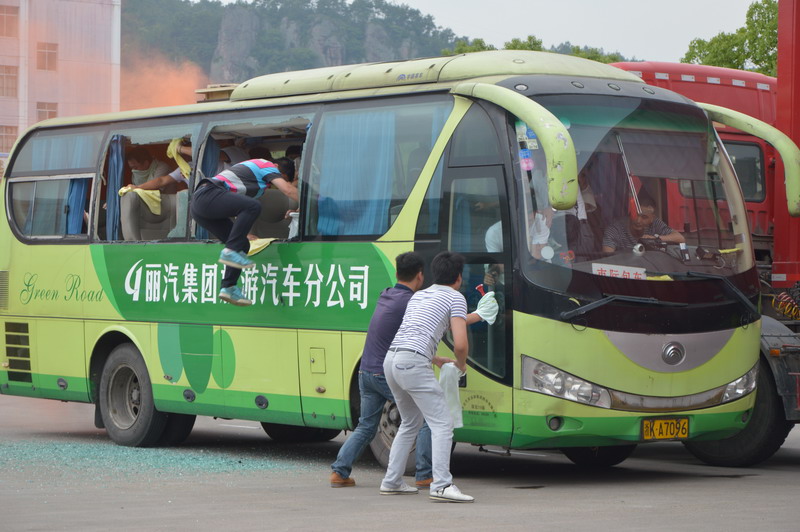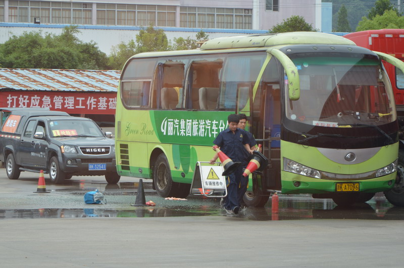 为了全面落实安全生产责任,检验评估丽水市突发事件应急救援预案和应急救援体系的适应性、有效性,最大限度地减少各类突发事件的损失和负面影响,6月10日下午,丽水市交通运输局联合市道路运输管理局和丽汽集团在客运西站组织开展了突发事件应急救援演练。此次应急救援演练共分2个科目,分别为:科目一交通事故(客车碰撞后起火燃烧)应急处置和科目二“三防”应急救援车辆调集演练。文首即为突发事件应急救援演练中交通事故应急处置中的一个场景,此次演练的另一个科目模拟市交通运输局紧急调用丽汽集团应急抢险运力展开。演练中,丽汽集团在接到市交通运输局应急抢险指令后,迅速启动了应急预案,并立即调派各单位应急抢险车辆在规定时间内到达指定区域待命。