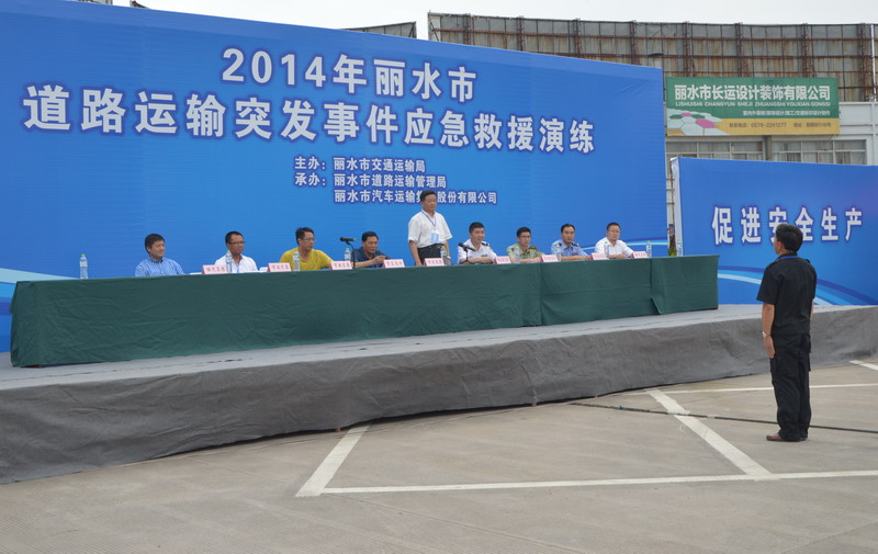 整个演练由市交通局党组副书记、副局长李根林任总指挥,市交通局副调研员叶彪、市运管局副局长金昌平任副总指挥,丽汽集团常务副总经理何赤诠任现场总指挥。演练共调集各类车辆近20台,80余人参与了演练。丽水市公安局副局长、丽水市交警支队支队长陈志斌,丽水市政府应急办主任尹耀新,丽水市消防支队副支队长郑志坚,丽水市安全生产监督管理局应急处处长王琦,丽水高速交警支队副支队长朱宏炜,丽汽集团党委书记、董事长叶茂,丽汽集团总经理薛和有等领导和丽汽集团相关管理人员共200余人观摩了整个演练过程。