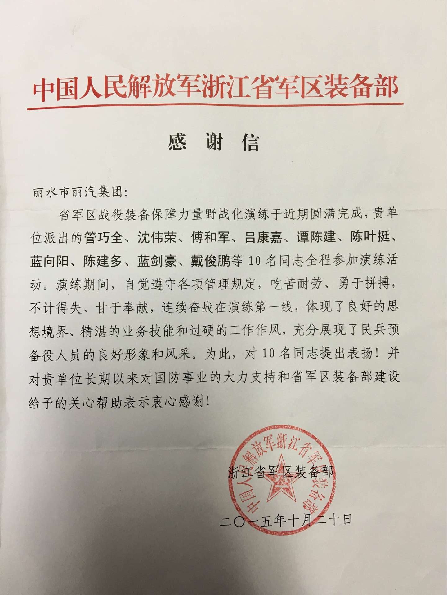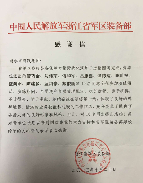 11月19日,丽汽集团收到浙江省军区装备部的一封感谢信。信中对来自快客、伊翔、长运、瓯龙等公司的修理工予以了表扬,充分肯定了丽汽员工在参加省军区装备部组织的战役装备保障力量野战化演练中的优异表现。