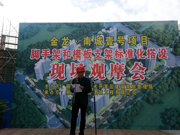 12月3日,由丽水经济技术开发区建设规划管理局主办的建筑施工现场观摩会在金龙•南城壹号项目工地现场召开。市建设局领导、开发区建规局领导、开发区在建和即将开建项目的建设单位、监理单位、施工单位共100余名代表走进项目现场,全方位观摩了南城壹号项目的安全标准化工地、项目精细化管理、人性化服务、特别是对脚手架和模板支架标准化搭设等内容。