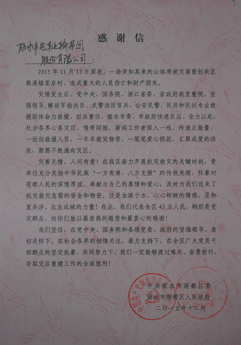 12月14日,集团公司收到莲都区委区政府送来的感谢信,感谢集团公司在里东灾区救援工作中的奉献。