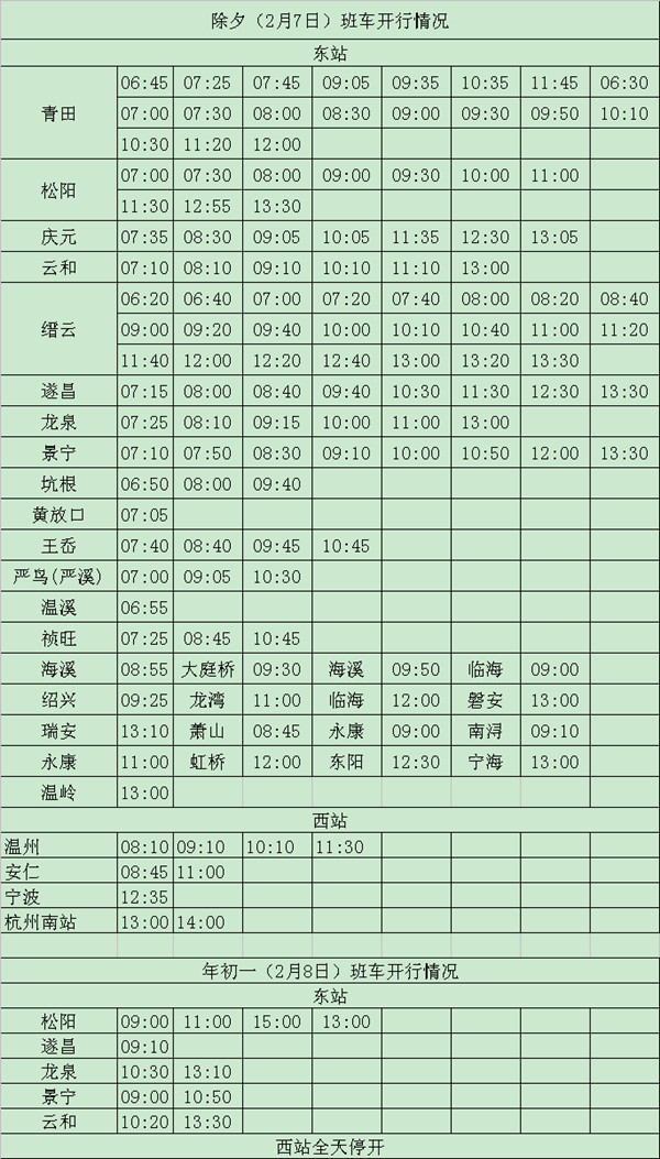 其中,除夕当天, 西站有开往杭州、宁波、温州等方向的市际班次和开往安仁的班车,最迟发车时间至14:00。东站有开往龙泉、 云和、 松阳、庆元、景宁、遂昌、缙云、青田及部分县市下属乡镇的县际班车,以及前往临海、绍兴、龙湾、瑞安、萧山、永康、虹桥、东阳、宁海、温岭等地的市际班车,最晚的发车时间为当天中午13点30分。正月初一,西站全线停运;东站有发往龙泉、松阳、景宁、遂昌、云和方向的县际班次 11班。根据班次安排,年初二客车班次逐渐恢复,年初四起全部恢复正常发班。