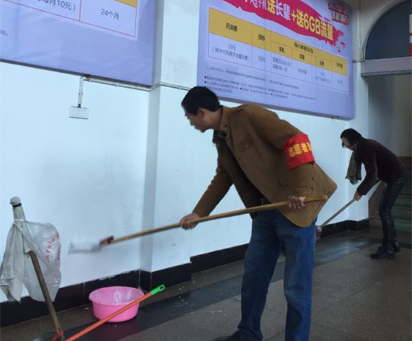 车站由于其特殊性,每天来往的旅客较多,流动性较强。各种原因导致候车厅、售票厅、发车区等区域的墙壁上留下各式各样无法擦拭的印痕。随着文明城市创建“国测”迎检工作的开始,东站党员志愿者主动放弃周末的休息时间,对重点区块的墙壁进行刷白和整个场地卫生死角的清扫。