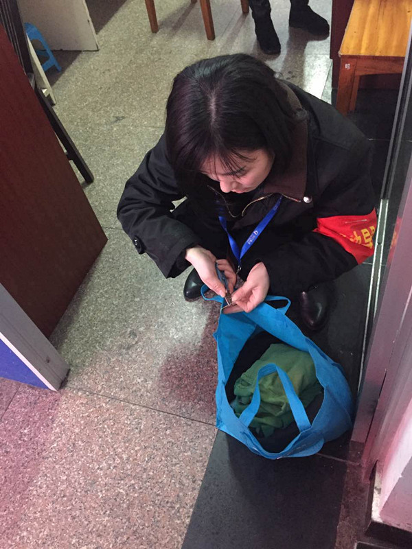 原来老伯一时疏忽只拎了环保袋一边的带子,由于一根带子的承受力有限,带子的一头断了。老伯边捡起东西住袋里放边嘟囔着:“这下怎么办好呢,又没有其它的袋子。”“我看缝一缝还能用,我们服务台备有针线,我帮你缝一缝。”程媛园安慰到。说着,快步跑进服务台,从便民盒里拿出针线认认真真的缝了起来。虽然一个环保袋值不了多少钱,可是她还是缝得非常地细致。没一会儿环保袋缝好了,老伯接过袋子还不忘带上老花镜看上一番,“你的针线活不错,要不是我的眼晴老花了,我的针线活也是可以的,我们以前当兵的时候针线活都是自己做的。你的服务这么好,我一定要把刚才给你拍的照片发到我的战友群里表扬表扬,你们东站的服务不错。”