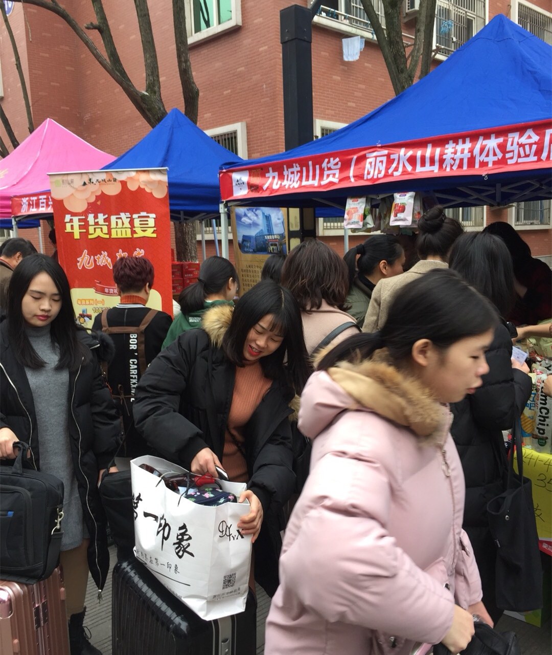 1月19日至1月21日,九城山货入场丽水职业技术学院第一届年货节。本次活动共有参展商12家,主要针对丽水职业技术学院师生,为广大师生提供年货采购渠道。 本次活动,九城山货提供年货种类多达几十种,包括各类礼包、甜橘柚和花果茶等等。1月19日一大早,九城山货的工作人员就忙开了,运输货品、清点货品、布置展位,早上8点30分一切准备就绪后便引来了大批师生,由于本次参展的各类产品价格低廉、产品优质,深受广大师生喜爱。