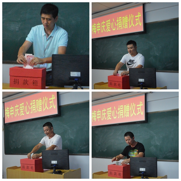 6月29日下午3时,爱心捐款仪式在汽校教室举行。校领导带头捐款,汽校教练员工也积极参加,大家都踊跃地为梅申庆向上了自己的一份爱心,还有两位学员还专门托教练捎来了捐款。短短几分钟内,就为梅申庆募捐到爱心款 3055元。汽校的金健飞校长更是在第一时间将这份汽校家人的关爱送到了在医院接受化疗的梅申庆手中。