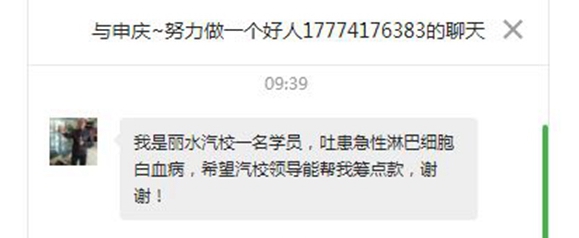 6月27日,丽汽集团汽车技术学校的微信公众号收到一条来自学员的消息:“我是丽汽汽校的一名学员,突患急性淋巴细胞白血病,希望汽校领导能帮我筹点款,谢谢!”