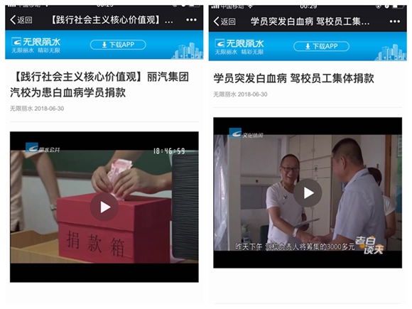 得知丽汽集团汽校这样一家培训机构,能自发为身患重病的外地学员组织爱心捐款后,丽水公共频道新闻和文化休闲频道老白谈天栏目专门就这一事件进行了专题报道,称赞这是一个践行社会主义核心价值观的爱心故事。