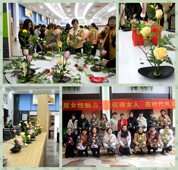 在插花分会场,丽水职业技术学院邱东萍副教授给大家讲解插花艺术和技巧,特别教了时下流行的用剑山插花技巧。紧接着女工们进行插花实践操作,分组进行插花比赛,只见女工们使出浑身解数,在美丽的鲜花面前,个个都心灵手巧,她们有用剑山、有用花泥插花,很快一盆盆靓丽的鲜花就得以呈现。邱东萍教授和助手们选出好的作品给大家一一作了点评。