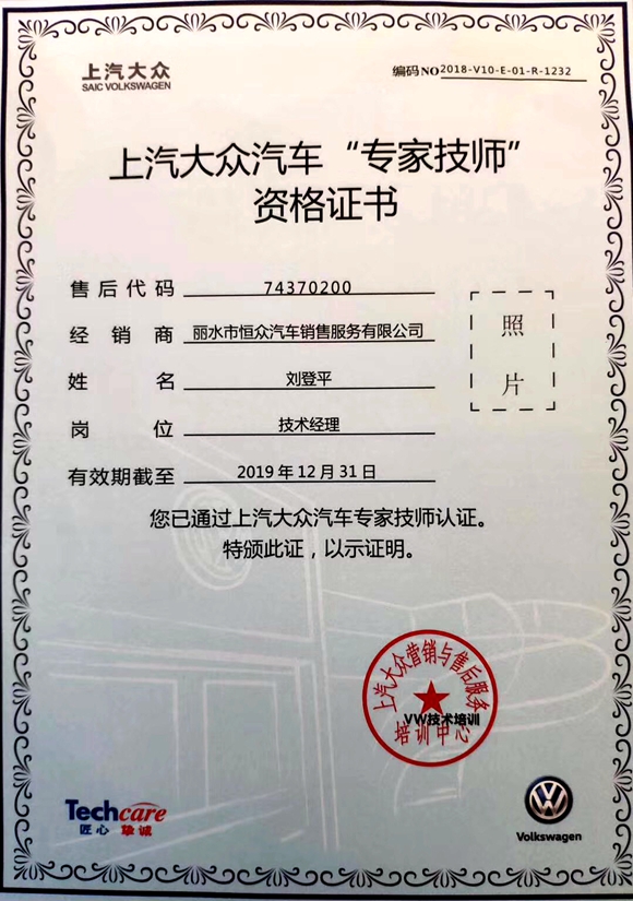近日,丽水恒众公司技术经理刘登平被评为上汽大众“专家技师”。这是上汽大众品牌进驻丽水市区以来员工首次获得该项荣誉。刘登平是上汽大众在丽水市目前唯一一个获此荣誉的专家技师。
