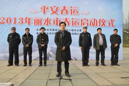 1月25日早上8:45分,“2013年丽水市平安春运启动仪式”在西站举行。丽水市副市长葛学斌、市交通运输局局长叶沙平、副局长沈利文、集团公司党委书记、董事长陈建敏、总经理薛和有,以及市公安局交警支队、高速交警丽水支队、市公路局路政支队、市运管运政支队和集团公司相关单位人员出席了启动仪式。仪式由丽水市政府副秘书长姚志强主持。葛学斌副市长、春运领导小组组长宣布2013年春运全面启动。