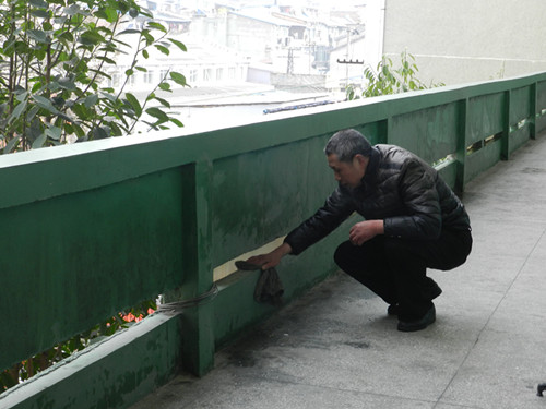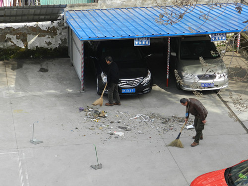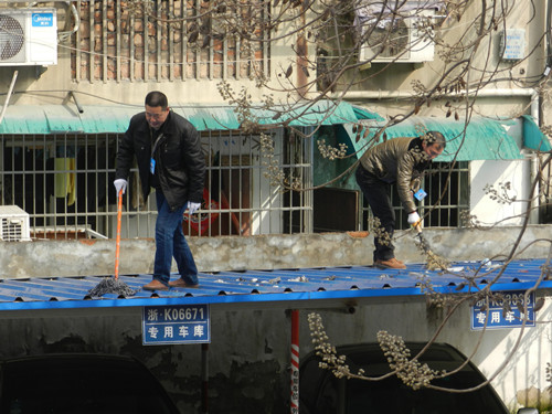 郑华副校长、金健飞副校长清理遮雨棚上的垃圾 打扫停车场地