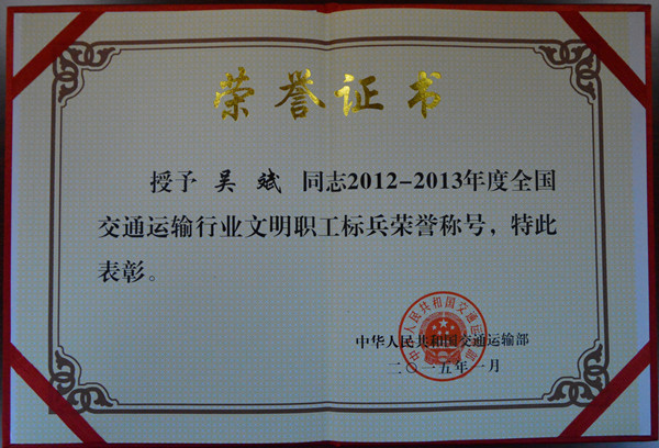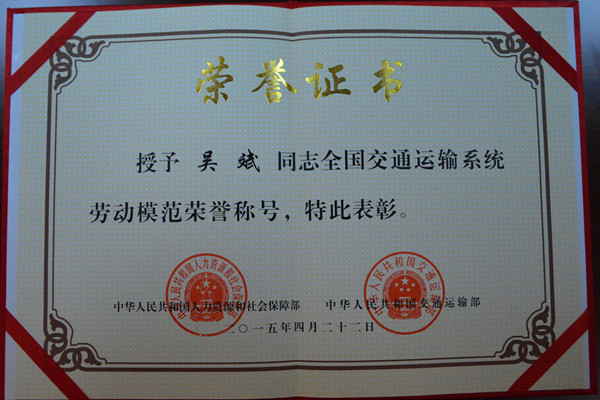吴斌(左)荣获全国交通运输系统劳动模范、全国交通运输行业文明职工标兵称号