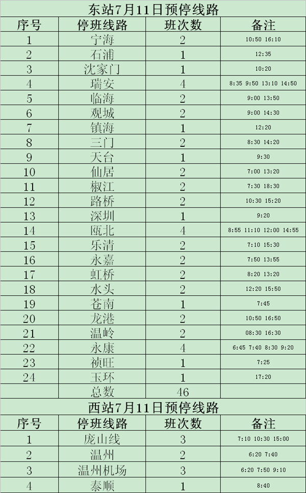 因台风“灿鸿”影响,为确保乘客安全,丽汽集团客运东、西两站暂时停开下列班车,具体复班时间视11日台风情况再行公告。