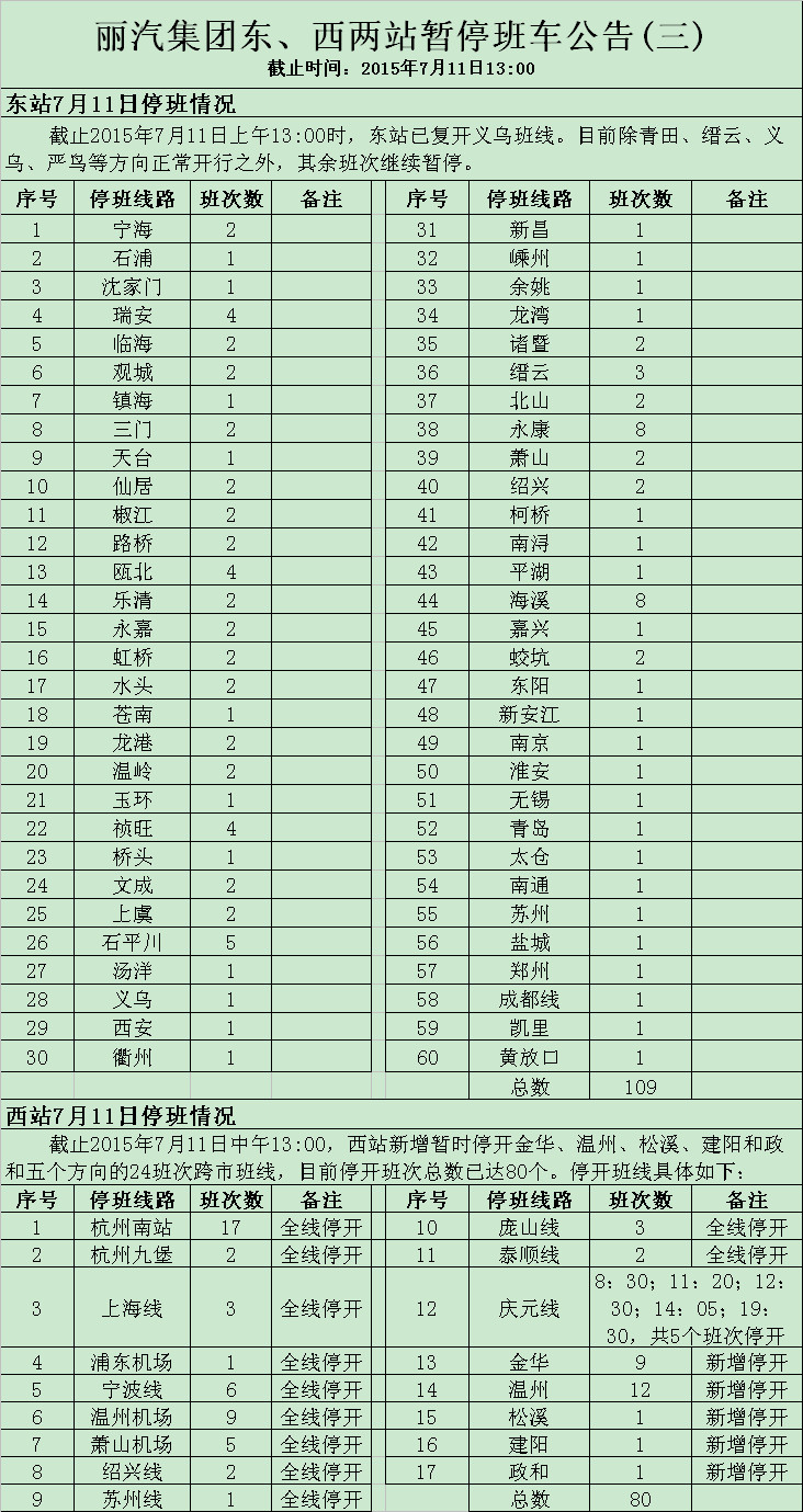 截止7月11日13:00,丽汽集团东、西两站班车停复班情况: