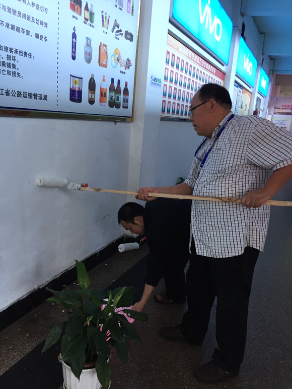 东站志愿者队售票厅、候车厅、发车区墙壁进行刷白