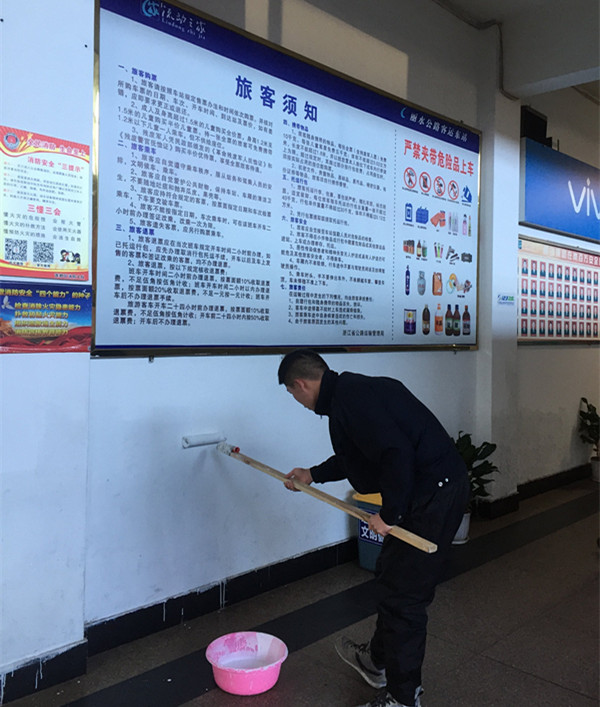 由于车站人流量大,候车厅、过道等地方的墙壁特别容易变脏。为了节省人工成本,江书记便买来了涂料,发动党员志愿者们利用休息时间对墙壁进行刷白。