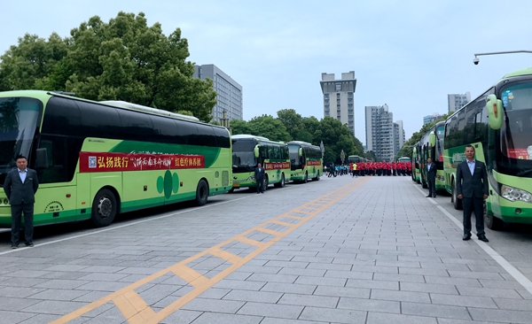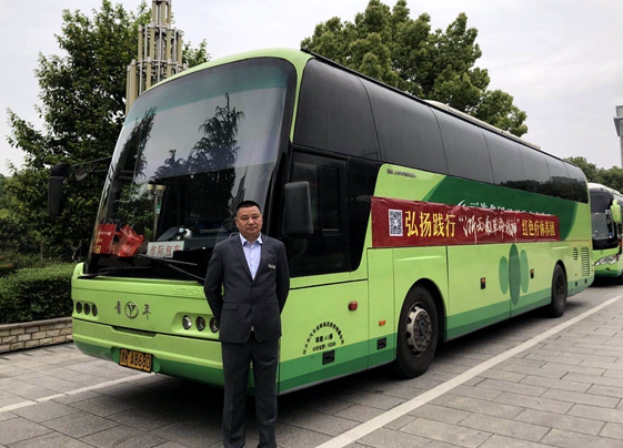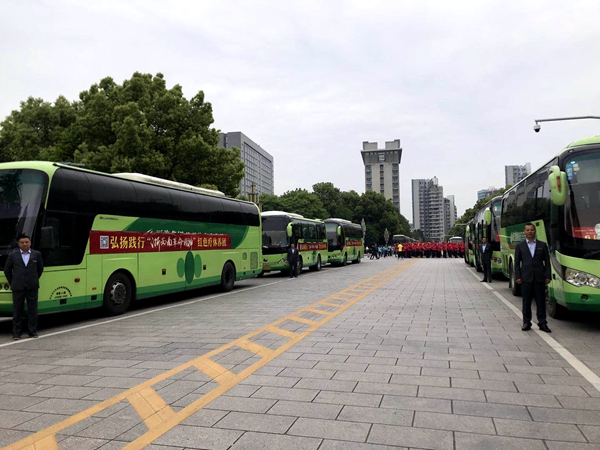 4月19日早上,在市政府南门广场,丽汽集团旅游汽车分公司16辆绿色豪华大巴齐刷刷地排列着,16位驾驶员统一着装,整齐划一地站在车门迎候游客。这是2019年丽水市弘扬践行“浙西南革命精神”系列活动启动仪式暨劳模、一线(优秀)职工红色疗休养活动发团仪式的现场。绿色大巴与着红色服装的先进相互映衬,形成了“红+绿”融合发展的场景,和谐的画面吸引了在场人员的关注,纷纷拿出手机拍场景,晒朋友圈。