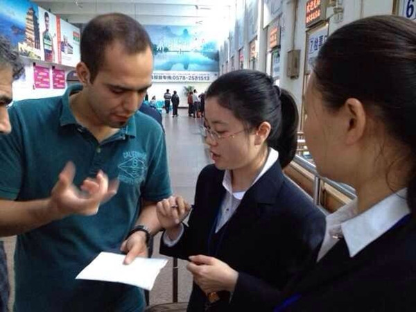 两名外国旅客因为有要事,等不了9:40的车。经过叶菁的一再沟通,乘客在通完一通电话后表示自己的朋友愿意开车送他们去义乌,就不再乘车了。充当“翻译”的叶菁又向宣站长转达了他们的意思,站长当即给他们办理了退票手续,手里握着退回金额的两名外国旅客连连道谢,念叨着:“Thank you! Thank you!"并对叶菁的热心帮忙竖起了大拇指。