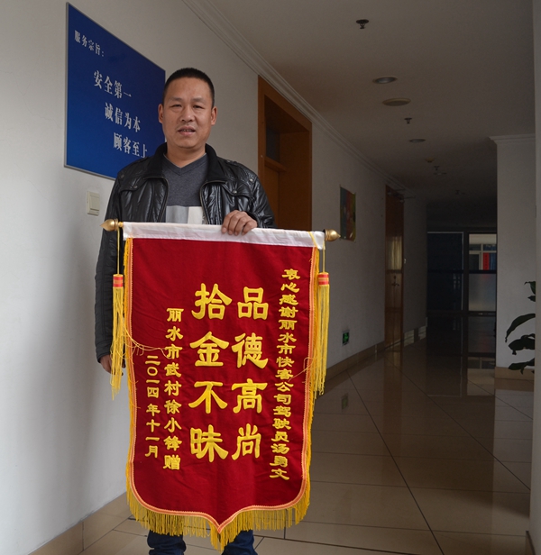 “拾金不昧,本不是新闻了,但轮到自己亲身体验这种社会正能量的日益增长,还是让我倍感欣喜。”10月16日傍晚,在江苏开超市的徐先生手拿锦旗,来到快客分公司车队,对驾驶员汤勇文拾金不昧的精神予以表扬。他说,11月14日他乘坐18:45从杭州回丽水的班车,一时大意把随身的钱包遗失了,里面有五千多元的现金和若干张银行卡。次日,当他焦急万分来到快客车队时,却发现驾驶员汤勇文正拿着妥善保管的皮夹等着他。