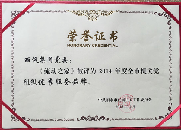 近日,丽汽集团“流动之家”服务品牌在中共丽水市直属机关工作委员会开展的2014年度全市机关党组织优秀学习品牌、优秀服务品牌评选活动中,喜获“2014年度全市机关党组织优秀服务品牌”称号。